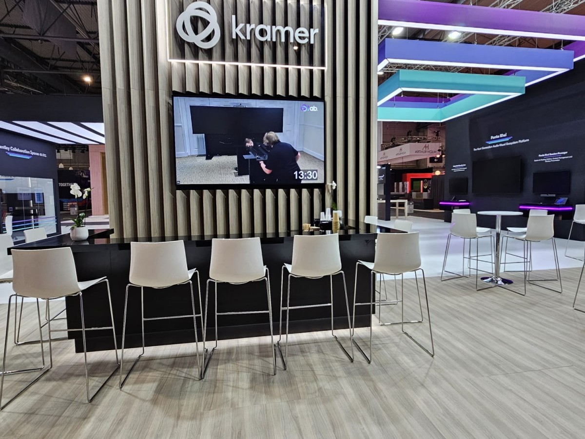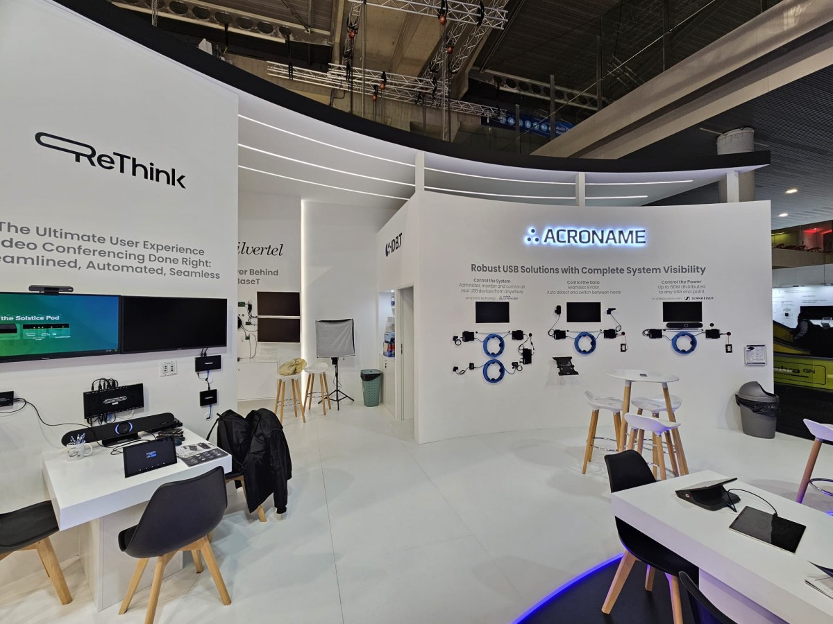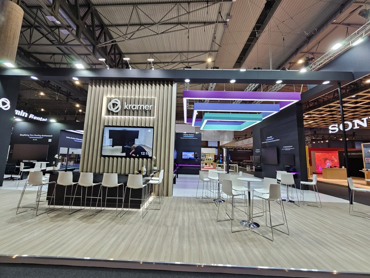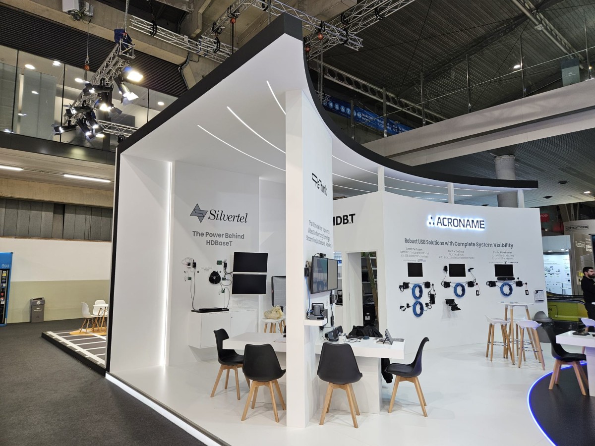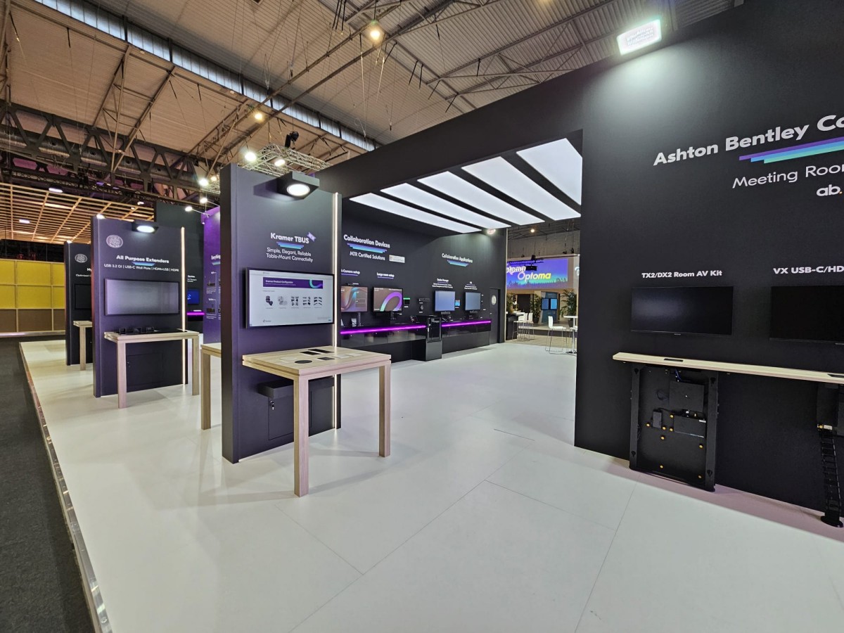 Produkcja, transport i montaż stoiska, Instalacja elektryczna Klimatyzacja Izolacja akustyczna ścian Podwieszenia Meble wykonane na zamówienie Wynajem mebli