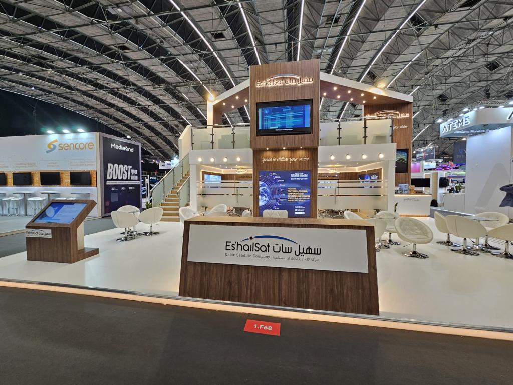 This double- deck booth was recently built for a three-day conference for the media industry in Amsterdam. Attention to detail can be seen in every element here, whether in the perfectly laid floor, where the joints of the panels are almost invisible, or in the elegant finish of the illuminated banners.